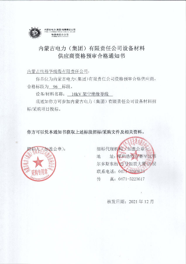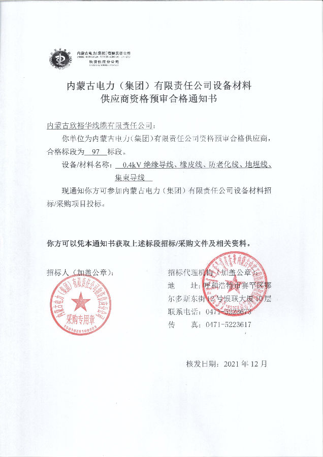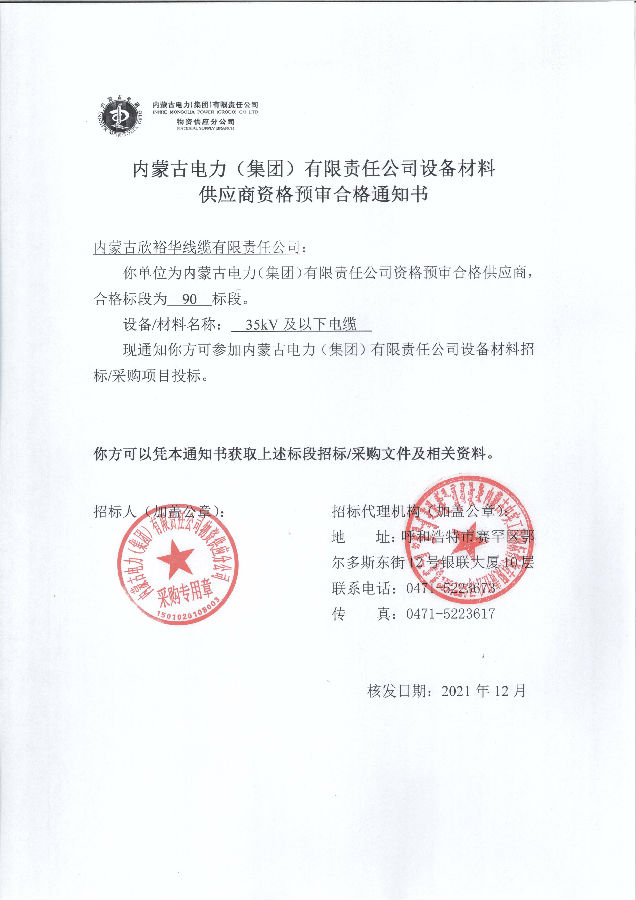 內(nèi)蒙古電力(集團)材料供應(yīng)商資格預(yù)審合格通知書