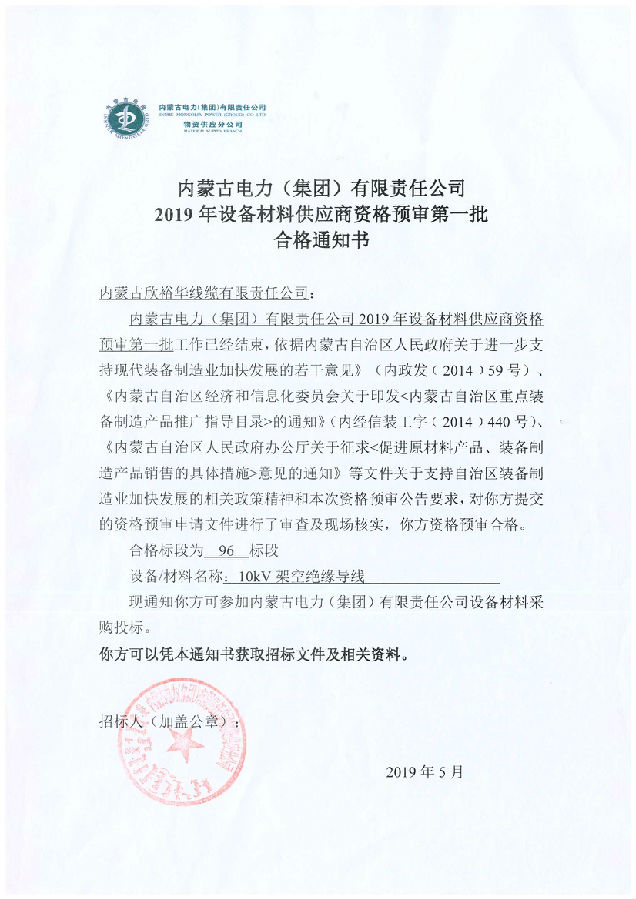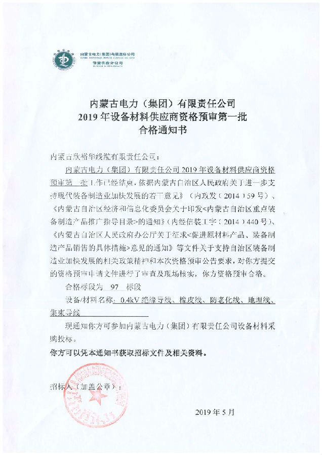 內蒙古電力(集團)材料供應商資格預審合格通知書